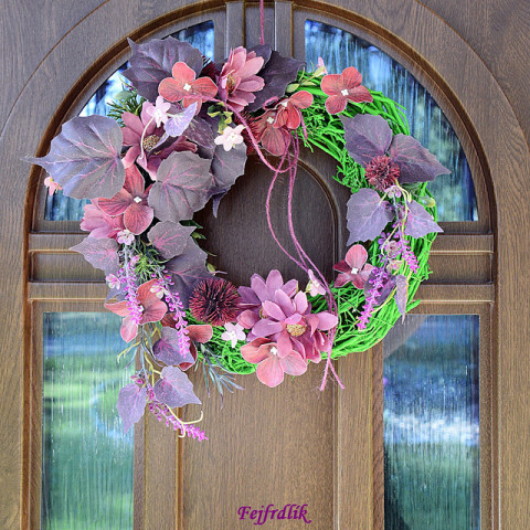 Originální dekorace na dveře, proutěný zelenkavý věnec s umělými a látkovými listy a květy s očkem na zavěšení. Průměr 32 cm.