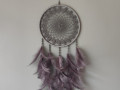 Základní kruh má průměr 24 cm. Kruh je omotán 100% bavlnou a vyplněn ručně háčkovanou krajkou z velmi kvalitní příze 50% bavlna a 50% polyakryl od českého výrobce. Na omotaném kruhu je na dřevěných korálcích a voskových perlách zavěšeno tmavě šedé pštrosí peří.