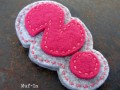 Brož ručně šitá z pevného filcu o vysoké gramáži 416 g/m², zapínání na brožový můstek. Kombinace šedé a sytě růžové.