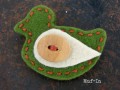 Ručně šitá brož ze dvou vrstev pevného filcu o vysoké gramáži 416 g/m², doplněná o dřevěný knoflík. Zapínání na brožový můstek.