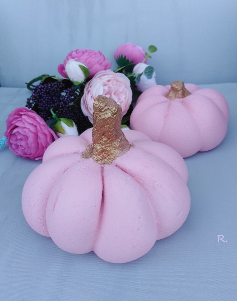 Růžová je moderní ...........Dvě růžové dýně z bílého betonu, který je pevnější a kvalitnější než klasický šedý. Dýně mají ťopky malované do měděna a jsou celé dvakrát ošetřené, penetrací a lakem.