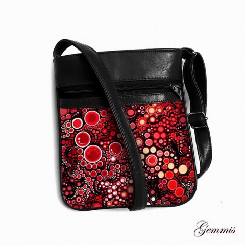 Na přední straně je praktická, plně funkční kapsa na zip z krásné látky s motivem bublinek , kterou lemuje černý pásek. Vnitřek kabelky je na zip, vypodšitý saténem a má ještě všitou kapsičku na doklady. Použitá koženka je v černé barvě s lehkým leskem.