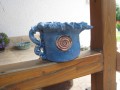 ručně modelovaný korbel, barvený výrazně modrou engobou s extravagantním ouškem, výška 13cm šířka 17cm,