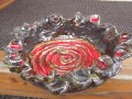 velmi zdařilá miska , dno a okraje posázené červenými sklíčky, které vytváří velmi zajímavou spirálu. výška této misy je 8cm a šířka 20cm. Možnost této misky je víceúčelový.