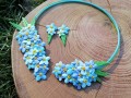 Sada náhrdelníku a náušnic, ručně vyrobeno z několika odstínů modré polymerové hmoty. Přívěsek je zajímavě řešený, krásně sedí na krku. Kvítky pomněnek jsou doplněné zlatým pudrem.