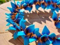 Sada náhrdelníku s naušnicemi, ručně tvarované lupínky z modré a tyrkys hmoty s jemným zlatým vzorkem. Lupínky jsou navlečené hustě vedle sebe na bižuterním lanku, naušnice jsou zavěšené na afroháčcích.