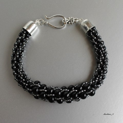 Ekluzivní, elegantní, ke všemu hodící se náramek jsem uháčkovala z černých voskovaných perliček dvou velikostí a vysoce kvalitního japonského TOHO rokajlu, šedého se stříbrným průtahem, díky kterému se vše krásně třpytí. Doplnila jsem esíčkovým zapínáním, délka náramku cca 22 cm.