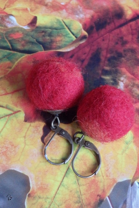 Plstěné náušnice mají průměr cca 2 cm a jsou doplněné komponenty z obecného kovu staromosazné barvy.