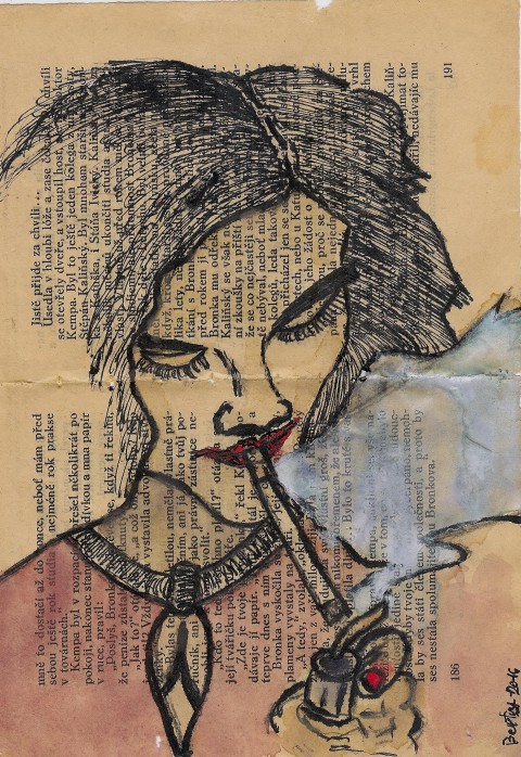 Femme Fatale - akvarel, perokresba (2016). Originál, kresba na volném dvojlistu ze staré knihy (17x25cm), bez pasparty. Barvy a tuš Winsor&Newton. Možnost osobního předání v Praze.