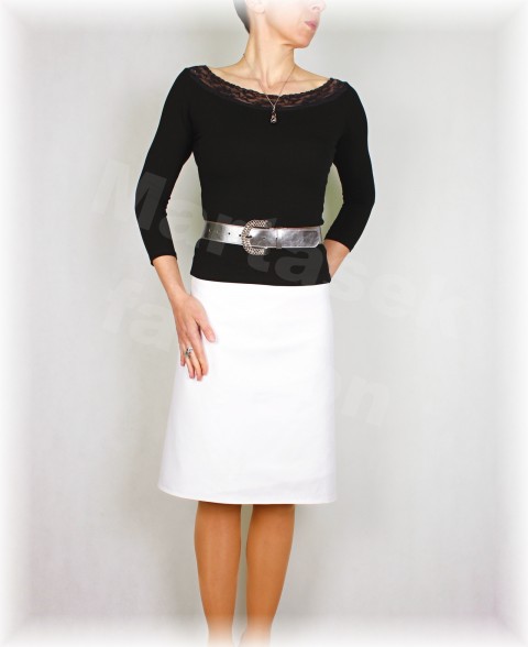 Sukně z bílé, elastické rifloviny ve střední gramáži, jde využít celoročně.Je to opravdu kvalitní riflovina a nemusíte se bát,že by prosvítala:) Střihově ji mohu ušít do A na boku se zipem nebo rovný střih.